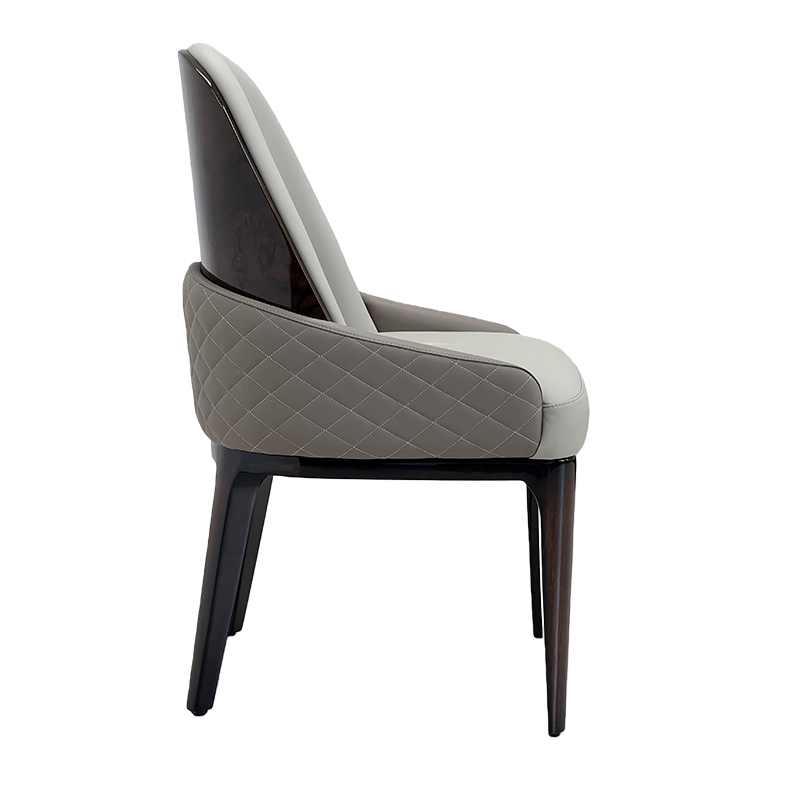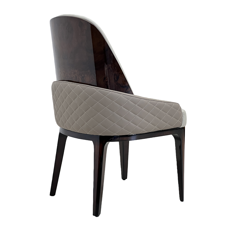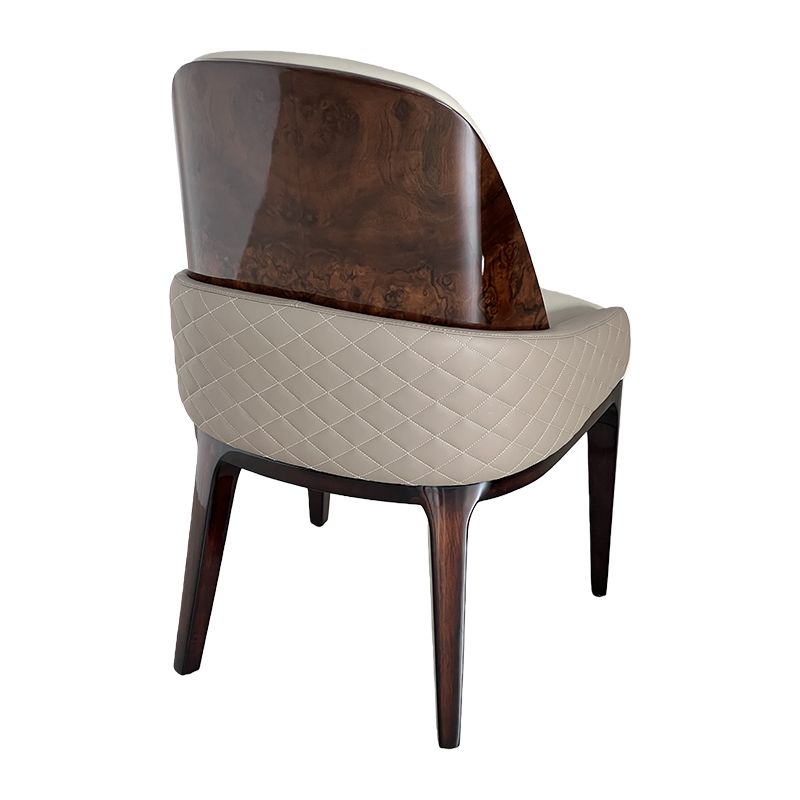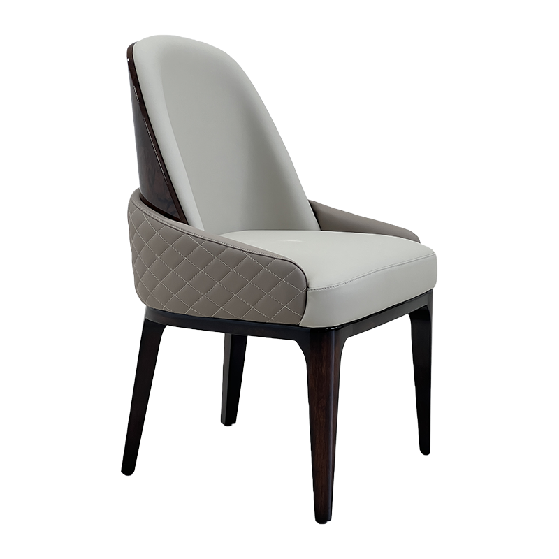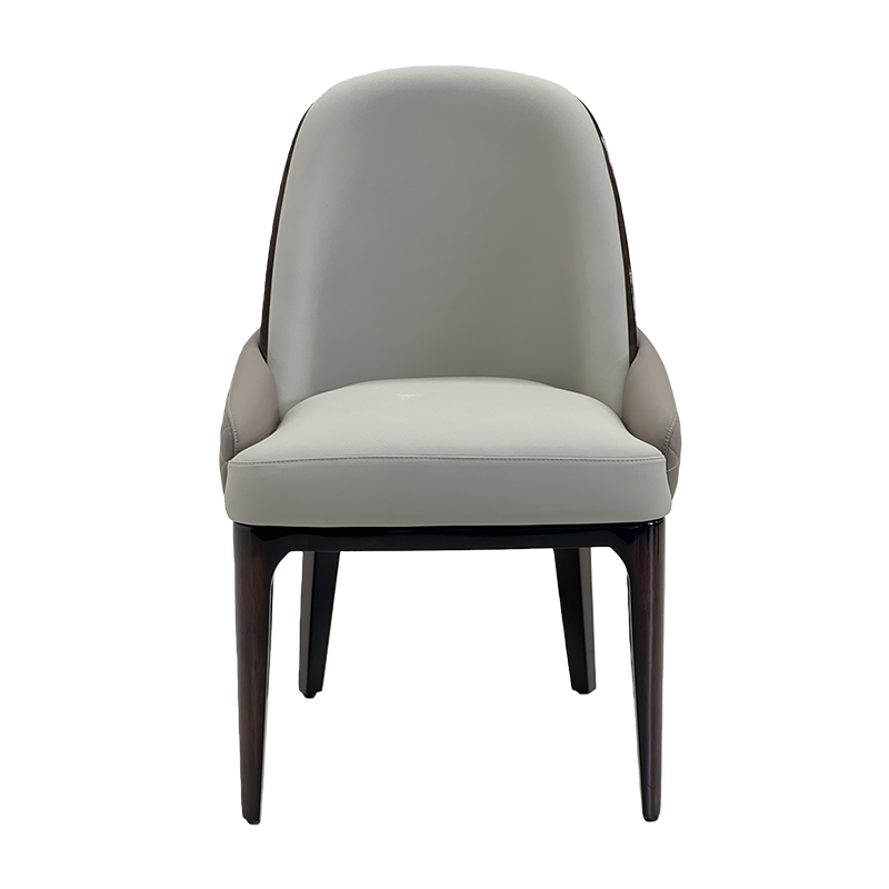 A refined luxury upholstered dining chair combining soft light-tone leather upholstery with a rich dark wood frame for an elegant modern look. The rounded high back and subtly wrapped arms provide supportive comfort, while the generously padded seat makes it ideal for extended dining and conversation. Perfect for modern luxury and Italian minimalist interiors—pair it with marble or stone-top dining tables in villas, penthouses, private clubs and show-flat staging.