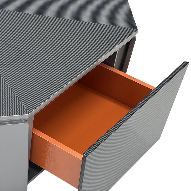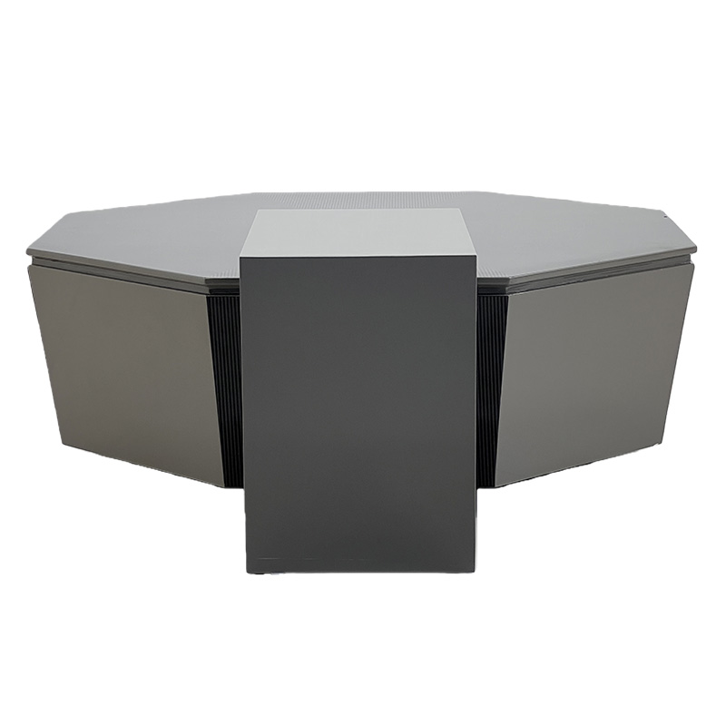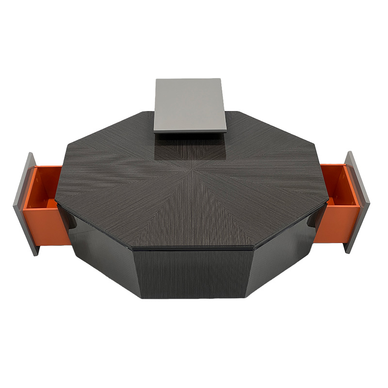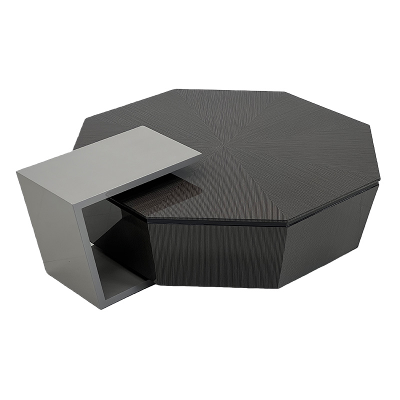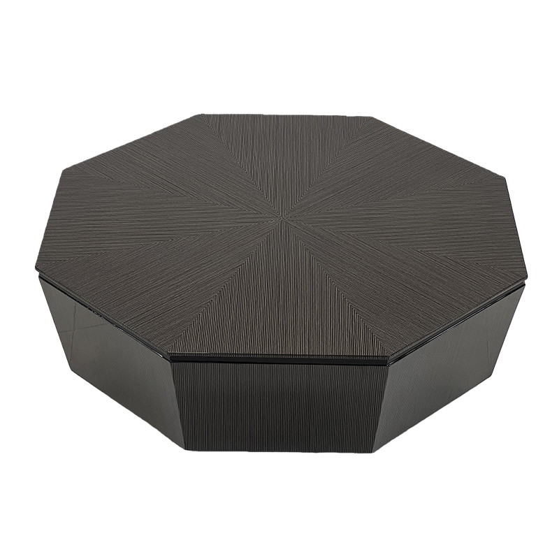A sculptural luxury geometric coffee table featuring a bold polygon silhouette and a starburst-style wood-grain top that draws the eye toward the center. Finished in a refined dark tone with glossy faceted sides, it delivers a strong statement coffee table presence for modern luxury interiors. The raised top platform adds practical surface space for décor, books, or serving essentials—ideal for villas, penthouses, private clubs, executive lounges and show-flat staging.