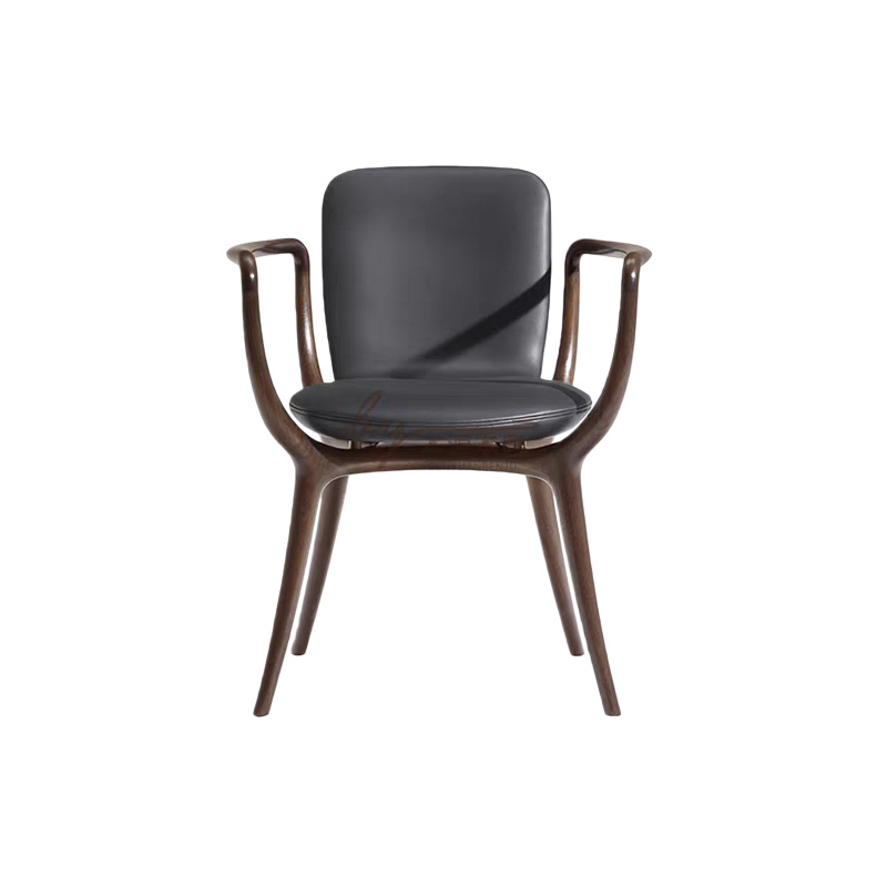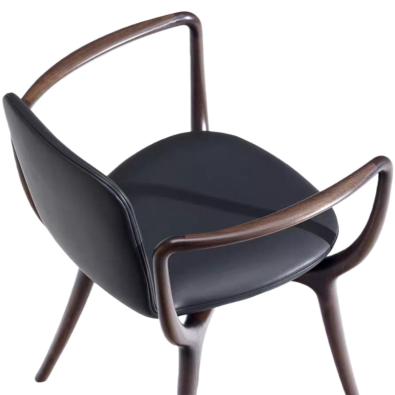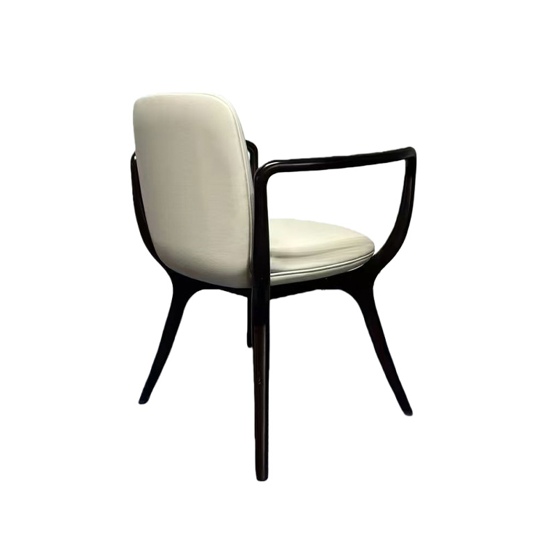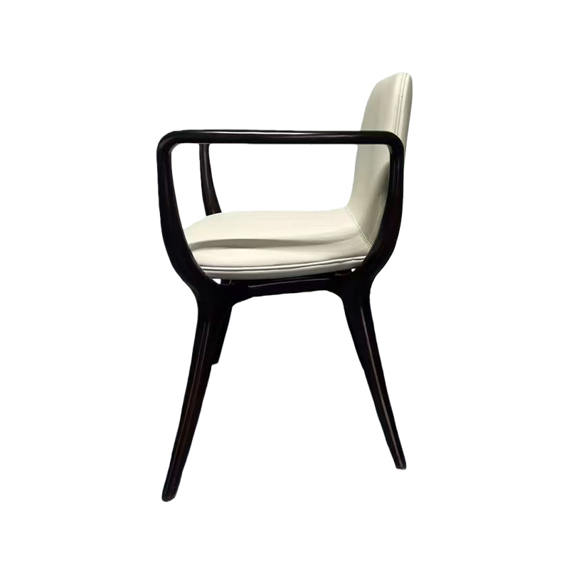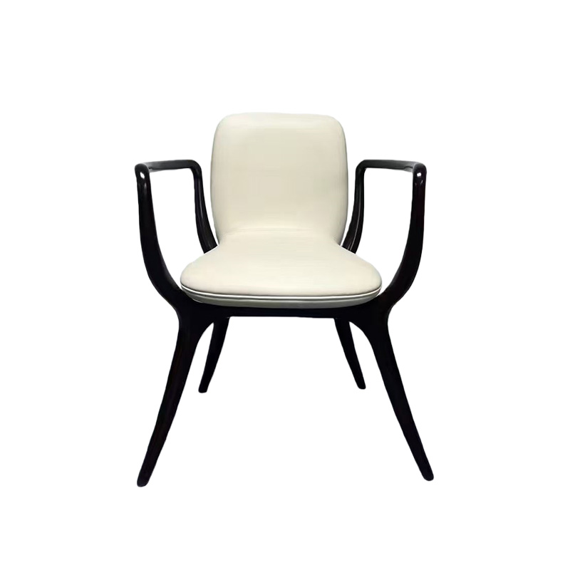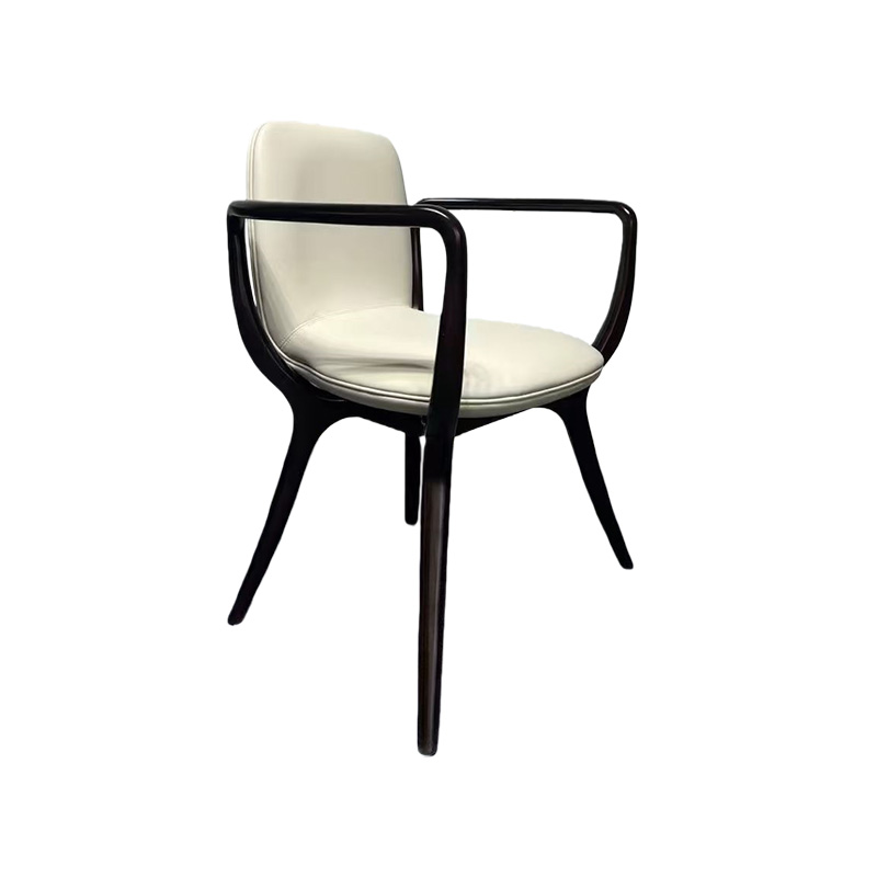 This luxury modern sculptural dining armchair features a glossy black wood frame with continuous, loop-like curves that create a striking yet refined silhouette. The ivory leather-upholstered seat and back add a clean, premium contrast and a soft touch that’s easy to maintain—ideal for modern luxury and Italian minimalist interiors. With a gently contoured backrest and supportive arms, it’s perfect for dining, conversation, and upscale hospitality settings such as villas, private clubs, boutique hotels, and show-flat staging.