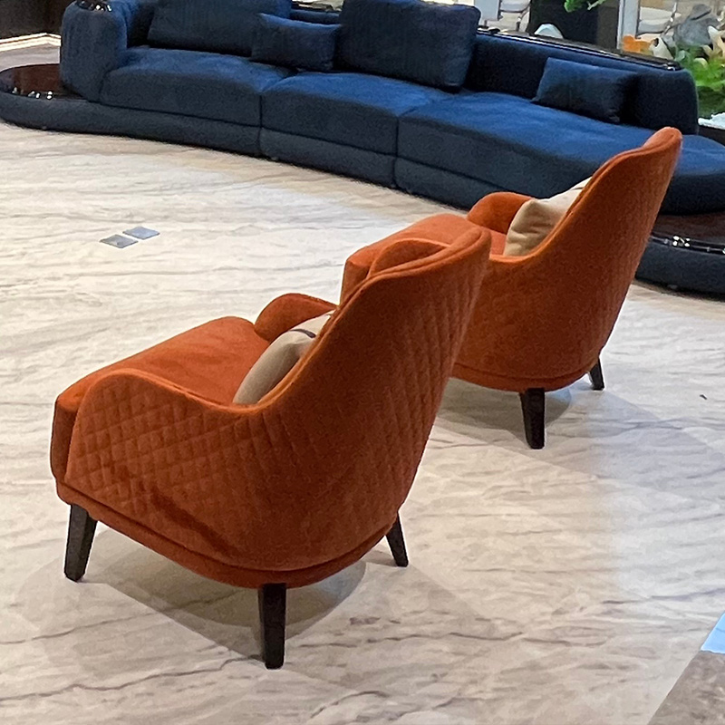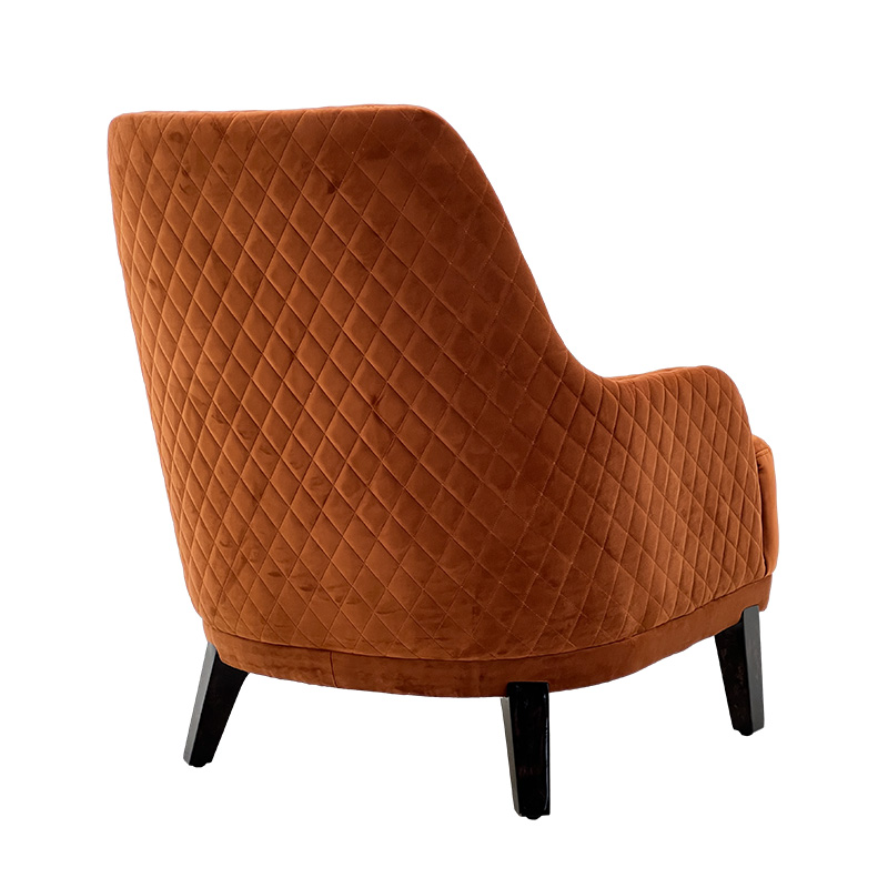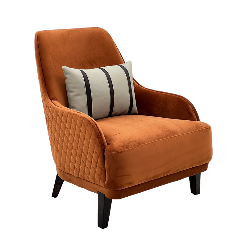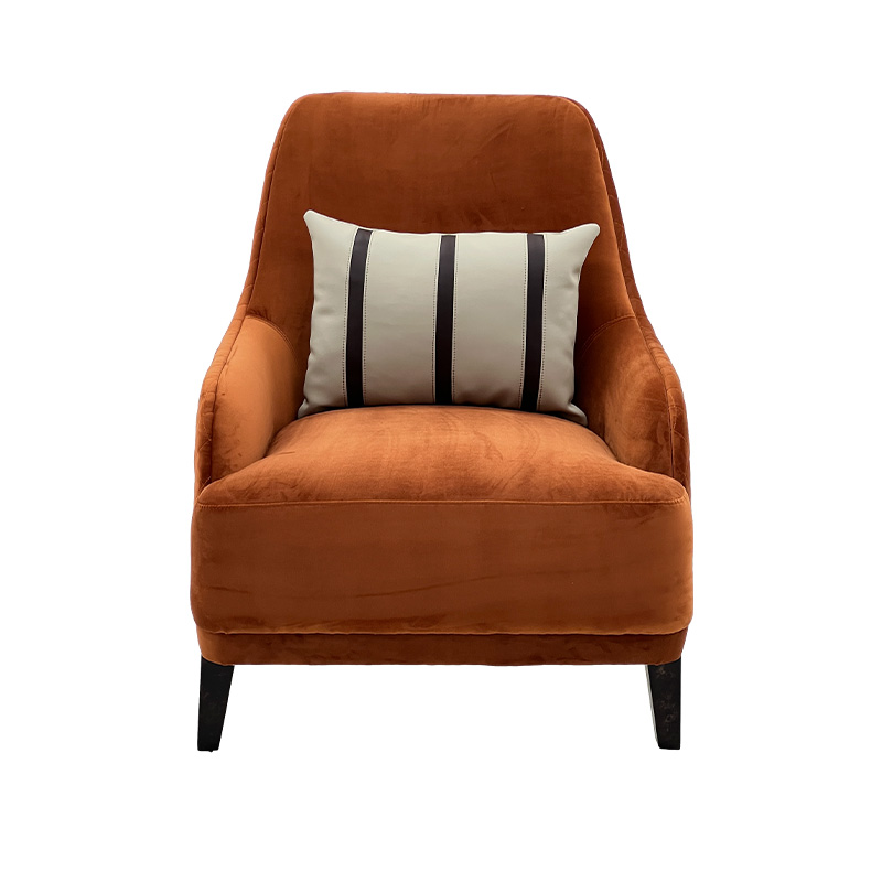 A warm and sophisticated luxury velvet accent lounge chair in a rich burnt-orange tone—perfect as a statement accent chair for villas, penthouses and show-flat styling. The wraparound arms and generously padded seat provide excellent comfort for reading, lounging or entertaining, while the minimalist dark legs and striped cushion add a modern luxury finish. Ideal for living rooms, lounges, hotel lobbies and private club spaces.