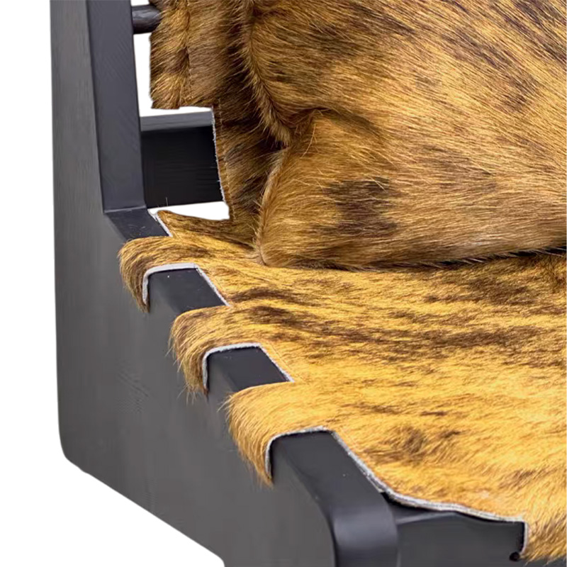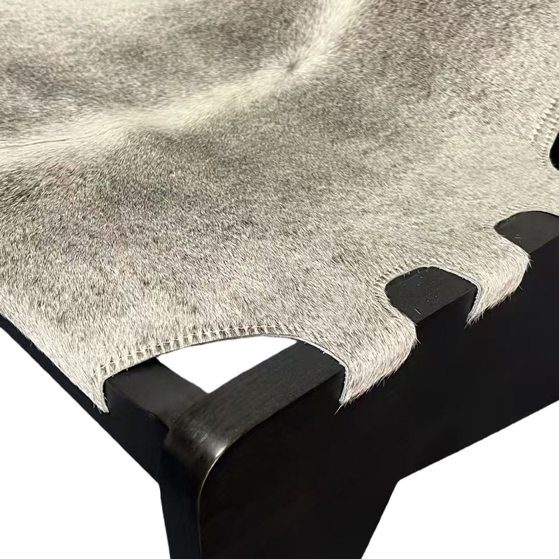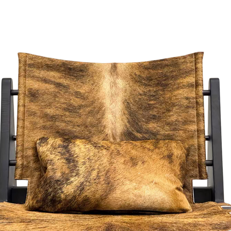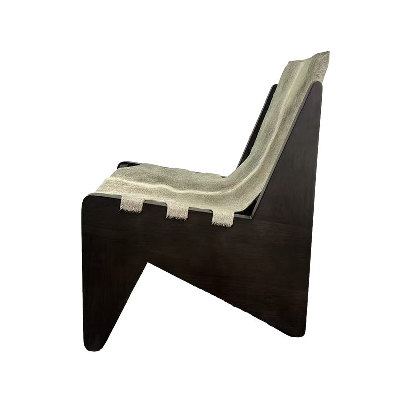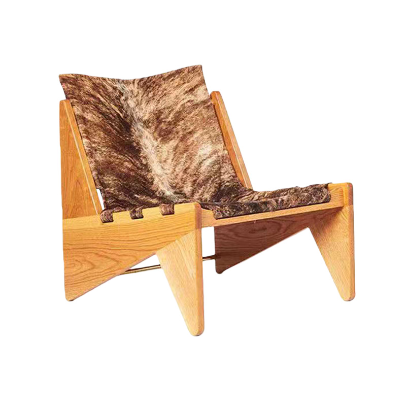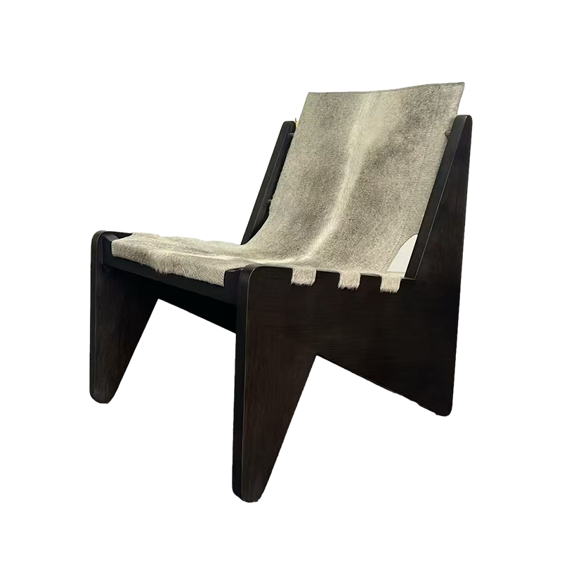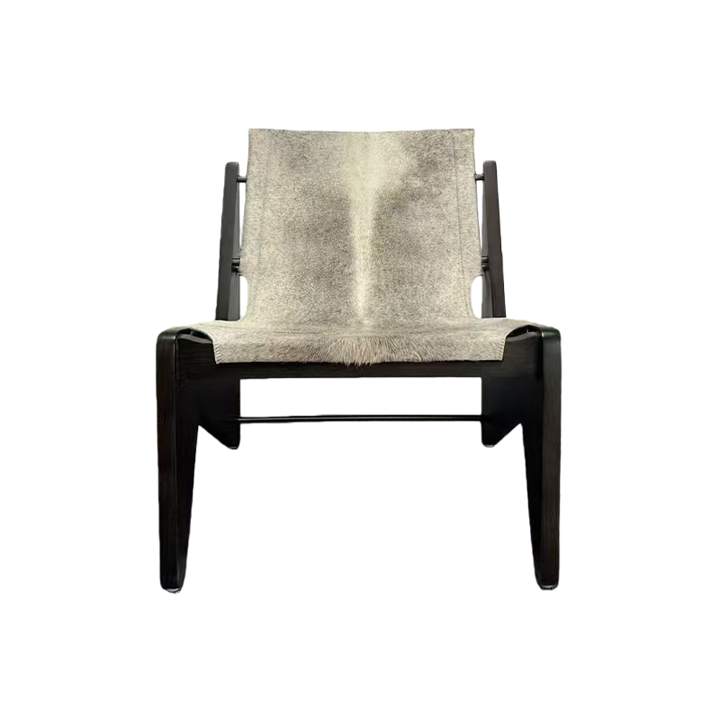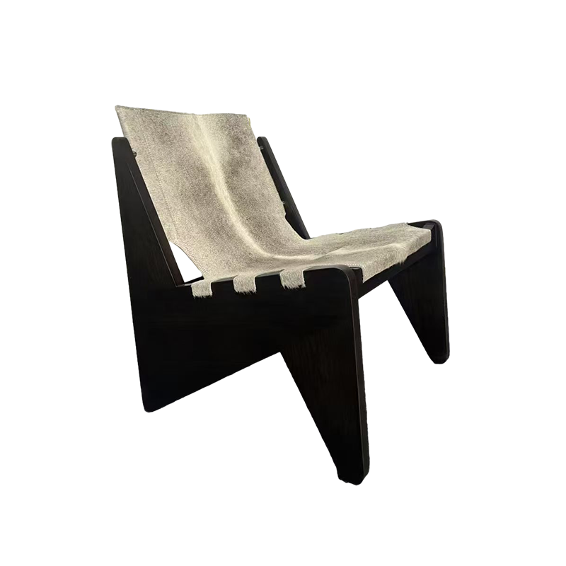 This luxury wabi-sabi sling lounge chair pairs a bold solid-wood frame with a naturally textured saddle leather (cowhide) sling seat, celebrating authentic materials and timeless craftsmanship. The geometric side panels provide strong architectural support, while the suspended leather seat offers gentle flexibility for a relaxed, comfortable sit. With its understated yet distinctive designer presence, it’s an ideal statement accent chair for villas, penthouses, private clubs, executive lounges, and curated living spaces.