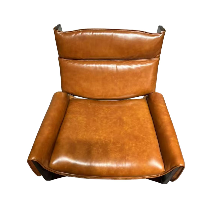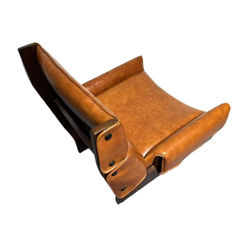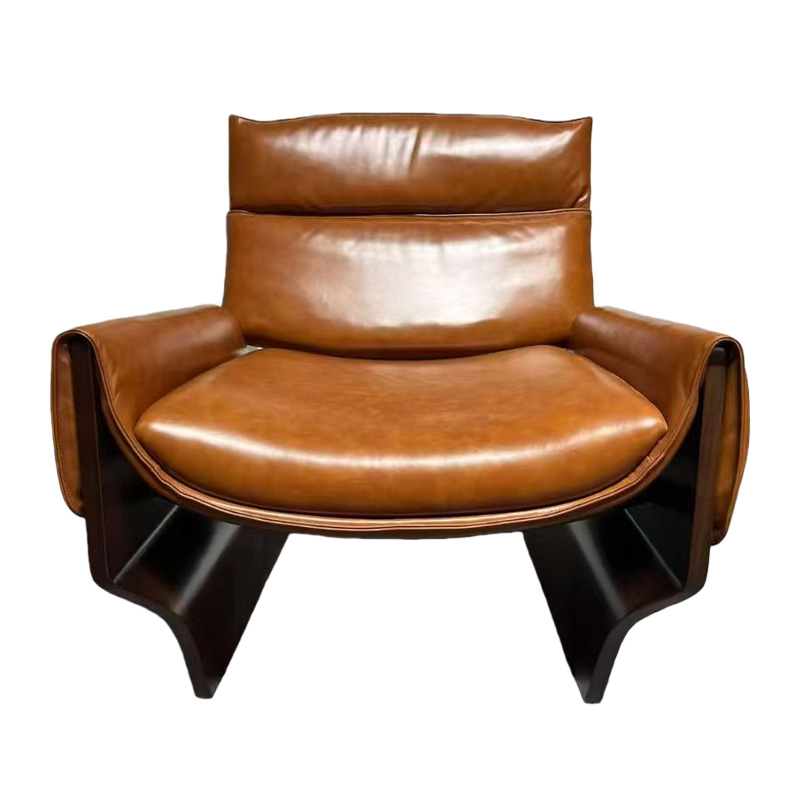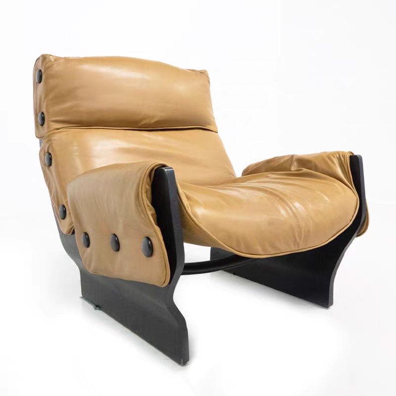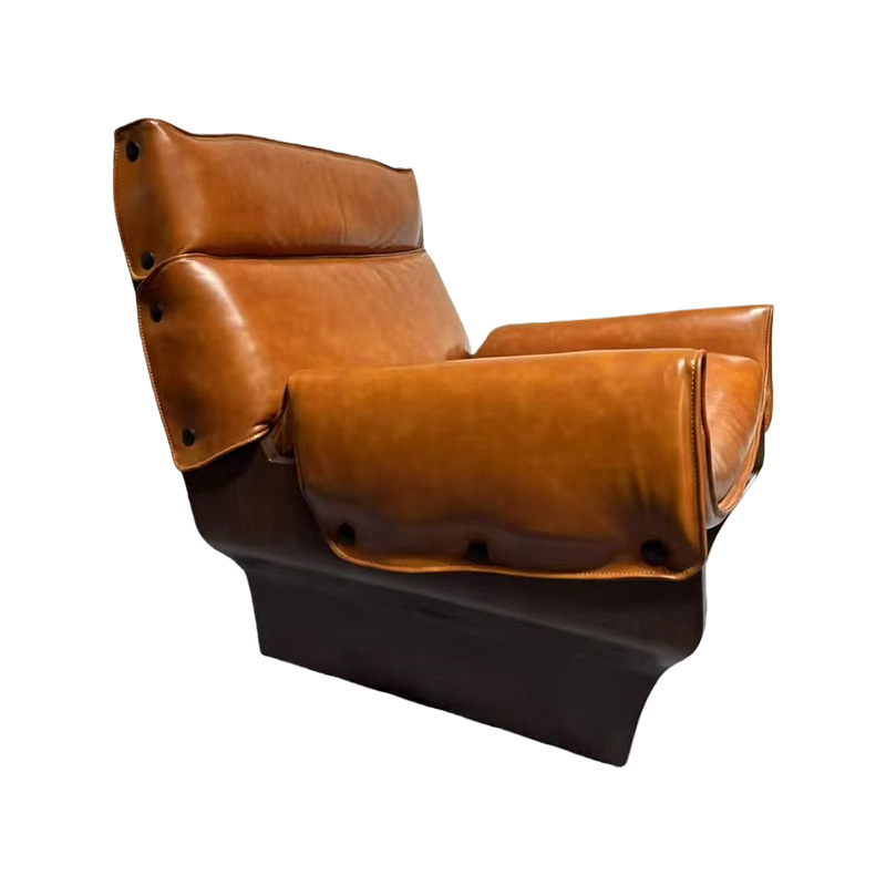 This vintage saddle-leather lounge chair blends a wrapped leather upholstery silhouette with a sculptural base, delivering a refined statement for modern luxury interiors. Upholstered in a warm caramel-toned leather, it features a naturally rich sheen and a soft, tactile feel. The relaxed, cocooning profile enhances the lounging experience, while the high back and wide armrests provide confident support and comfort.